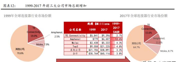 并購浪潮和亞洲廠商的崛起沖擊了原有的競爭格局,但全球整體競爭格局相對穩(wěn)定,北美行業(yè)集中度有所提高。從1985年到2018年10月1日,Bishop Associates記錄到連接器行業(yè)完成并購589起,2000年以后共完成并購463起。在并購浪潮中,三大連接器巨頭安費諾、泰科、莫萊克斯一直在積極收購部分競爭對手。安費諾從1999年到2018年收購了52家公司。同期,泰科電子收購了25家公司,Molex收購了27家公司。大規(guī)模的M&A在一定程度上推動了行業(yè)集中度的提高,前三名公司的市場份額從1999年的29.4%上升到2017年的64.7%。值得注意的是,1980年排名前10的公司中沒有亞洲公司,但2016年排名前10的有6家亞洲公司,包括李勛京密、富士康(鴻海)、雅崎、JAE、J.S.T和廣瀨,這也與亞洲電子制造能力的提高和亞洲連接器市場需求的擴大密切相關。此外,一些早期的大公司被M&A活動中的較大實體所吸收,例如杜邦公司被弗拉馬通公司(FCI)收購,然后又被安費諾公司收購。雖然全球連接器行業(yè)前十大廠商的地位發(fā)生了很大變化,但行業(yè)整體競爭格局相對穩(wěn)定。比如1980年以來,TE Connectivity一直是最大的連接器公司,從AMP更名為泰科國際,再更名為泰科電子,再更名為現(xiàn)在的TE Connectivity。Molex和Amphenol都在前十。1980年,未能在2018年保持前十名的前十家公司包括ITT坎農(nóng)(坎農(nóng))、伯格3M、溫徹斯特(Winchester)、奧格特(Ogut)、辛奇連接解決方案(Cinch Connectivity Solutions)和伯恩迪(Burndy),其中大部分被總部公司收購。