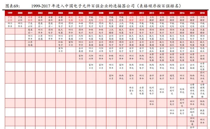 廣闊的市場空間為小廠家的反擊奠定了一定的基礎。據(jù)TTI引用畢曉普協(xié)理數(shù)據(jù),2018年全球連接器市場達到667.1億美元;據(jù)《全球市場洞察》報道,2018年全球電容器市場為190億美元,不到連接器市場的30%。集中度方面,根據(jù)郭巨公司公告,2018年占據(jù)電容器市場份額43%以上的MLCC環(huán)球CR5達到79%;然而,自1980年以來,全球連接器市場僅從38%增長到60%,市場壟斷程度明顯低于MLCC。在市場空間廣闊、集中度相對較低、對材料等底層技術積累要求較低、定制度高的背景下,國內中小型連接器企業(yè)有一定的生存空間。一個更直觀的例子是,2000年中國加入世貿(mào)組織后,一些領域實現(xiàn)了自由化。從2001年到2004年,杏樹(外資企業(yè))在百強連接器排行榜上排名第一。但逐漸被德潤電子、航天電器、AVIC光電等國內企業(yè)超越。在廣闊的市場規(guī)模下,這類企業(yè)以聚焦精品軌道為發(fā)展起點,并逐漸占據(jù)一席之地。