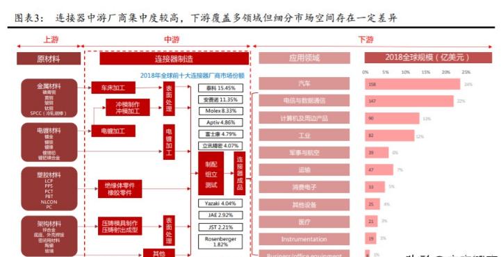 連接器產(chǎn)業(yè)鏈涵蓋了從上游金屬材料、塑料材料、電鍍材料到下游汽車、通信、消費電子、國防軍工等多個領域。行業(yè)上游主要是黑色金屬、有色金屬、稀有貴金屬、工程塑料等原材料加工行業(yè)。上游原材料的價格和運輸成本是連接器成本控制的關鍵。但由于上游多為大宗商品,價格波動較低,且供應商較多,連接器企業(yè)一般不會基于規(guī)模經(jīng)濟向上游擴展供應鏈系統(tǒng)。連接器作為傳輸信號和交換信息的基本單位,決定了電子信息領域涉及的所有終端產(chǎn)品都需要使用,因為連接器的下游幾乎覆蓋了電子行業(yè)的整個領域。然而,由于終端需求和單個產(chǎn)品信息程度的不同,分段連接器的市場規(guī)模在不同領域有很大差異。例如,畢曉普協(xié)會(Bishop Associates)的數(shù)據(jù)顯示,2018年,全球汽車連接器市場規(guī)模達到158億美元,而國防和航空領域的連接器規(guī)模僅為39億美元,僅占汽車領域規(guī)模的25%左右。