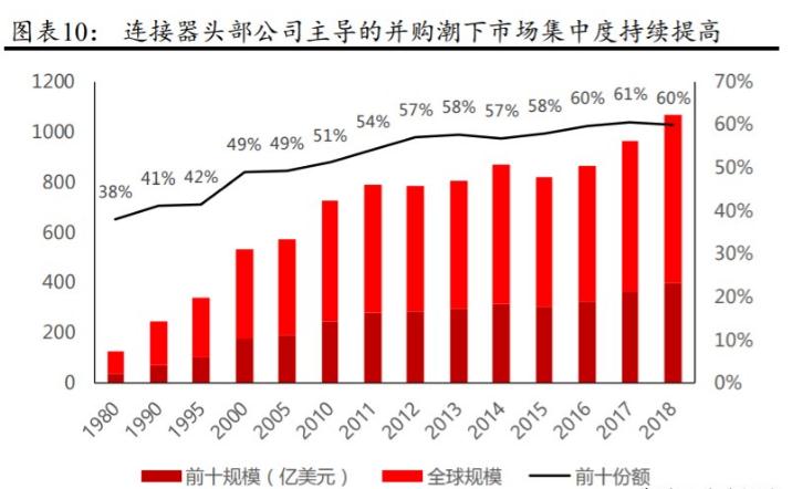 并購浪潮和亞洲廠商的崛起沖擊了原有的競爭格局,但全球整體競爭格局相對穩(wěn)定,北美行業(yè)集中度有所提高。從1985年到2018年10月1日,Bishop Associates記錄到連接器行業(yè)完成并購589起,2000年以后共完成并購463起。在并購浪潮中,三大連接器巨頭安費諾、泰科、莫萊克斯一直在積極收購部分競爭對手。安費諾從1999年到2018年收購了52家公司。同期,泰科電子收購了25家公司,Molex收購了27家公司。大規(guī)模的M&A在一定程度上推動了行業(yè)集中度的提高,前三名公司的市場份額從1999年的29.4%上升到2017年的64.7%。值得注意的是,1980年排名前10的公司中沒有亞洲公司,但2016年排名前10的有6家亞洲公司,包括李勛京密、富士康(鴻海)、雅崎、JAE、J.S.T和廣瀨,這也與亞洲電子制造能力的提高和亞洲連接器市場需求的擴大密切相關。此外,一些早期的大公司被M&A活動中的較大實體所吸收,例如杜邦公司被弗拉馬通公司(FCI)收購,然后又被安費諾公司收購。雖然全球連接器行業(yè)前十大廠商的地位發(fā)生了很大變化,但行業(yè)整體競爭格局相對穩(wěn)定。比如1980年以來,TE Connectivity一直是最大的連接器公司,從AMP更名為泰科國際,再更名為泰科電子,再更名為現(xiàn)在的TE Connectivity。Molex和Amphenol都在前十。1980年,未能在2018年保持前十名的前十家公司包括ITT坎農(nóng)(坎農(nóng))、伯格3M、溫徹斯特(Winchester)、奧格特(Ogut)、辛奇連接解決方案(Cinch Connectivity Solutions)和伯恩迪(Burndy),其中大部分被總部公司收購。