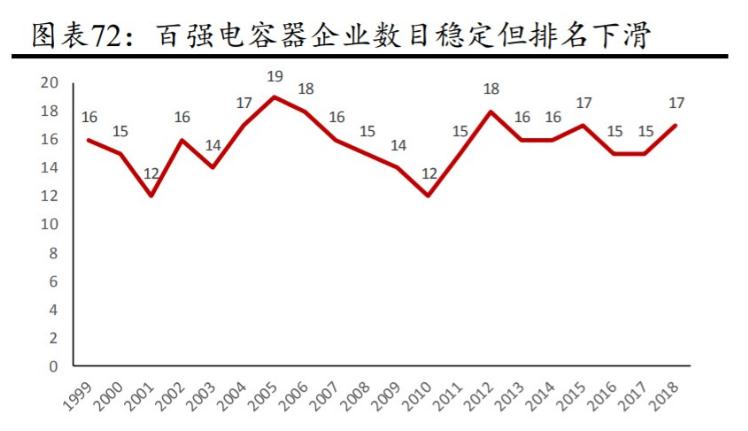 從數(shù)字上看,進入中國電子元器件企業(yè)百強名單的連接器企業(yè)數(shù)量逐漸增多。從1999年到2018年,進入中國電子元器件百強名單的連接器企業(yè)數(shù)量逐步增加,從1999年的2家增加到2018年的13家。同時,進入百強榜單的連接器企業(yè)排名也逐漸提高。在2008年(含)之前,國內還沒有連接器企業(yè)進入前20名,之后以李勛精密和AVIC光電為代表的公司一步步走到了前列。2015年后,進入中國零部件前20名的連接器企業(yè)數(shù)量穩(wěn)定在3-4家。但連接器公司進入前100強的數(shù)量增加,意味著其他電子元器件公司的排名在下降,競爭力逐漸喪失。我們選擇了同樣廣泛使用的電容器的競爭模式作為比較對象。主要電容器企業(yè)的數(shù)量(包括MLCC和薄膜電容器等。)進入百強榜單保持相對穩(wěn)定,但整體排名持續(xù)下滑。例如,廣東奉化高新從1999年的第4位跌至2018年的第11位,同期南通江海從第19位跌至第36位。